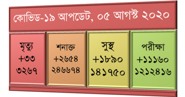 গত ২৪ ঘণ্টায় ১১১৬০ জন জনের নমুনা পরীক্ষা সম্পন্ন করা হয়েছে। এদের মধ্যে ২৬৫৪ জনের শরীরে করোনা ভাইরাসের অস্তিত্ব শনাক্ত হয়েছে। মোট আক্রান্তের সংখ্যা দাঁড়িয়েছে ২৪৬৬৭৪ জন। আর ২৪ ঘণ্টায় ১৮৯০ জন সুস্থ হয়েছেন এ পর্যন্ত মোট সুস্থ হয়ে উঠেছেন ১ লাখ ৪১ হাজার ৭৫০ জন করোনা আক্রান্ত রোগী।