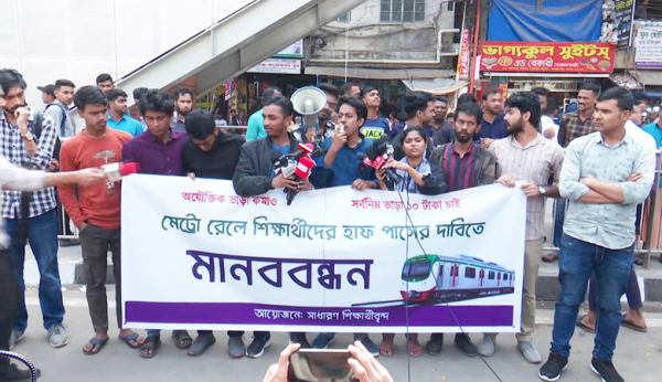 মেট্রোরেলে হাফ ভাড়ার দাবিতে শিক্ষার্থীদের মানববন্ধন
